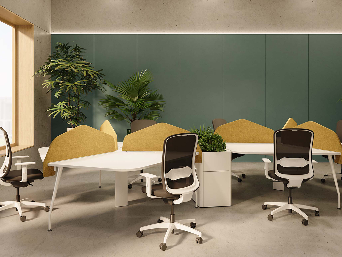 Además, los paneles ACOUSTIC junto a mamparas (LINE, TAM, M92) controlan el ruido y preservan luz natural, aspectos clave para la comodidad mental y física.