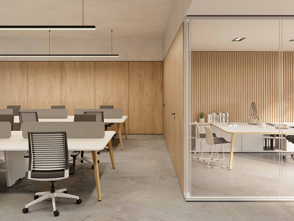 En outre, les panneaux ACOUSTIC et les cloisons (LINE, TAM, M92) contrôlent le bruit et préservent la lumière naturelle, aspects essentiels pour le confort mental et physique.