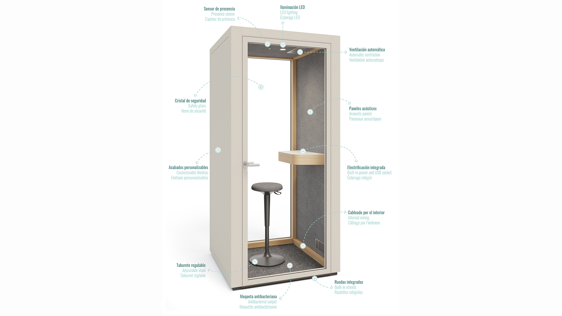 La cabine Eva Booth de Dynamobel cherche à maintenir la distance avec le reste des utilisateurs pour apporter le calme d’un refuge au bureau. Une solution équipée des caractéristiques d’un espace de travail agile, d’utilisation temporaire et de rotation continue, qui offre aux utilisateurs une autre voie de travail.