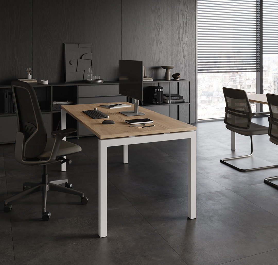 La variante con más capacidad de electrificación. La mesa llega a asimilar toda la instalación técnica y de equipos manteniendo su limpieza estética. Está disponible en dos opciones diferentes: canal enrasado y canal sobre – elevado. La versión canal enrasado dispone de dos perfiles de aluminio donde se colocan los distintos paneles y accesorios, duplicando, si cabe, las posibilidades de optimización y aprovechamiento de espacios de trabajo. Cuando el canal es sobreelevado, el acceso del cableado al canal de electrificación es mediante dos tapas abatibles que convierten a este puesto en la solución más potente de electrificación.