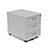 Se ha combinado el blanco de las encimeras de las mesas con el color grafito de su estructura. Las cajoneras, diseñadas específicamente para el proyecto, cuentan con una envolvente metálica blanca y con un cojín tapizado en color rojo en la parte superior, con función tanto para guardado como asiento auxiliar, para realizar tareas colaborativas entre los usuarios en el mismo puesto.